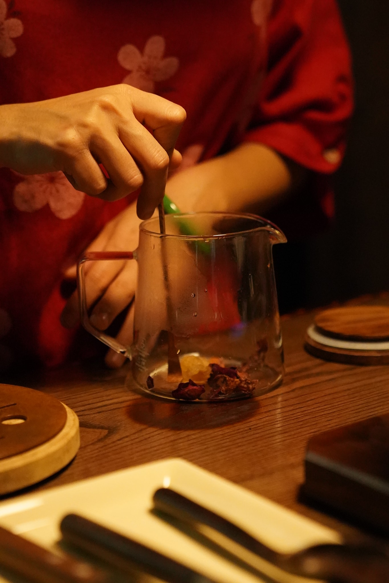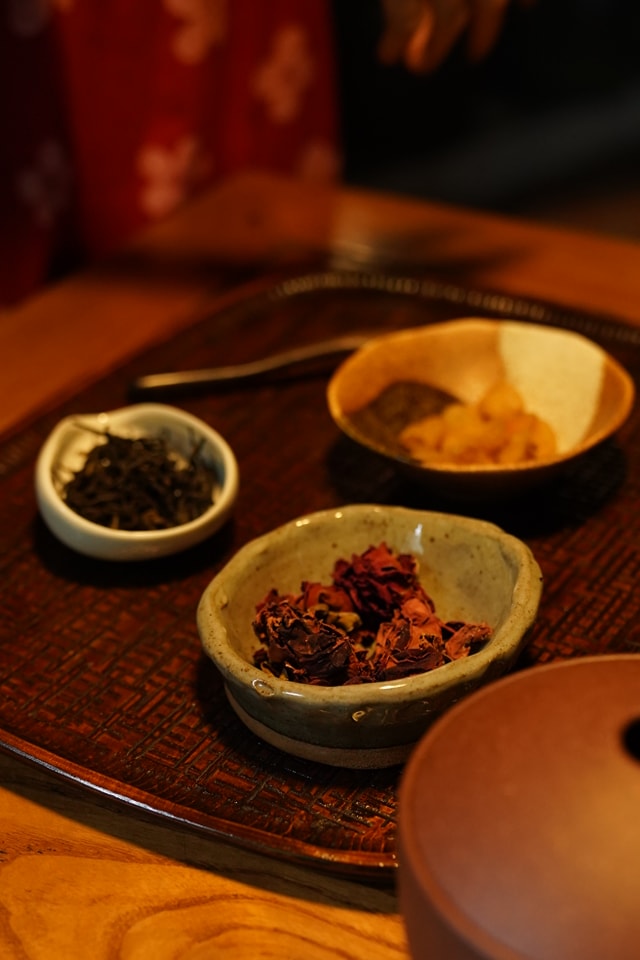 - Cho một ít cánh hoa hồng (khoảng 5-6 cánh), long nhãn vào ấm. Tráng qua nước sôi và bỏ ngay phần nước thức trà đó đi.